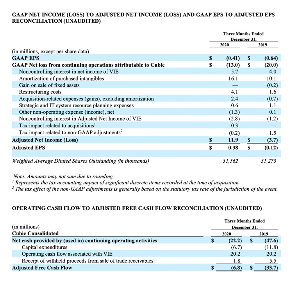 Adjusted Free Cash Flow is defined as Net cash provided by continuing operations, excluding operating cash flow associated with the VIE in which Cubic has a 10% equity stake, less capital expenditures plus proceeds from the sale of fixed assets and the receipt of withheld proceeds from the sale of trade receivables. The VIE has contracted with Cubic for the design-build and operations and maintenance phases of the next-generation fare collection system for the Massachusetts Bay Transportation Authority and pays Cubic progress payments during the design-build phase of the project. These payments are primarily funded by non-recourse debt issued by the VIE. Additional information regarding the VIE can be found in Cubic’s Annual Report on Form 10-K for the fiscal year ended September 30, 2020 and its subsequent Quarterly Reports on Form 10-Q. Management believes that Adjusted Free Cash Flow is meaningful to investors because management reviews cash flows generated from operations after taking into consideration capital expenditures, which are necessary to maintain and expand Cubic’s business, in addition to the other adjustments noted above. Adjusted Free Cash Flow does not represent the residual cash flow available for discretionary expenditures since other nondiscretionary expenditures are not deducted from the measure.